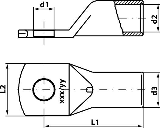 | Code number | Designation mm²/Screw M | d1 mm | d2 mm | d3 mm | L1 mm | L2 mm | Broj presovanja meh./hidr. | Package pcs | Weight g/100kom |