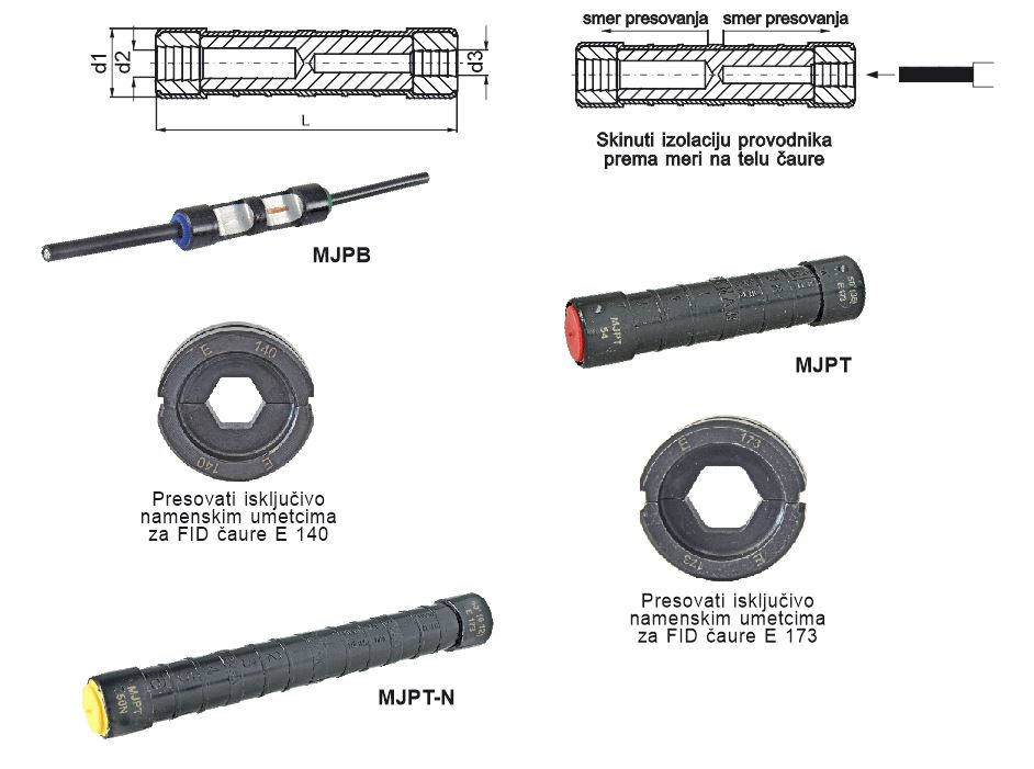 Služe za spajanje izolovanih aluminijumskih i bakarnih provodnika koji se koriste za priključivanje stambenih i javnih objekata na distributivnu mrežu kao i za spajanje provodnika distributivnog SKS-a napona do 1kV. FID čaure preseka do 25mm2 uglavnom se primenjuju kod spajanja kučnih priključaka. FID-F čaure preseka 35, 50 i 70mm2 koriste se za spajanje faznih provodnika distributivnog SKS. FID-N čaure preseka 70mm2 koriste se za spajanje nosivog provodnika kod distributivnog SKS-a. Sve ove čaure se isporučuju sa specijalnom izolacijom. šestougaono presovanje se vrši direktno preko te izolacije koja ima odlične mehaničke i električne karakteristike. Za presovanje se koriste standardne “FEMAN” prese sa specijalnim umetkom. Koristeći uputstvo na izolaciji čaure, uklonite izolaciju sa krajeva provodnika na potrebnoj dužini. Zatim se provodnici uvlače u čauru kroz gumene zaptivke, koje sprečavaju prodor vlage i pojavu elektrolitičke korozije. Na izolaciji su naznačena mesta i redosled gde je potrebno izvršiti presovanje. Kod FID – čaure se vrši, u zavisnosti od debljine umetka, po dva ili tri presovanja od sredine levo i desno. FID-N – čaura za nulti (noseći) provodnik je nešto duža s obzirom da je spoj podvrgnut mehaničkom opterećenju i zato se vrši po šest presovanja od sredine čaure, levo i desno. Čaure su urađene u skladu sa standardom EN 50483.