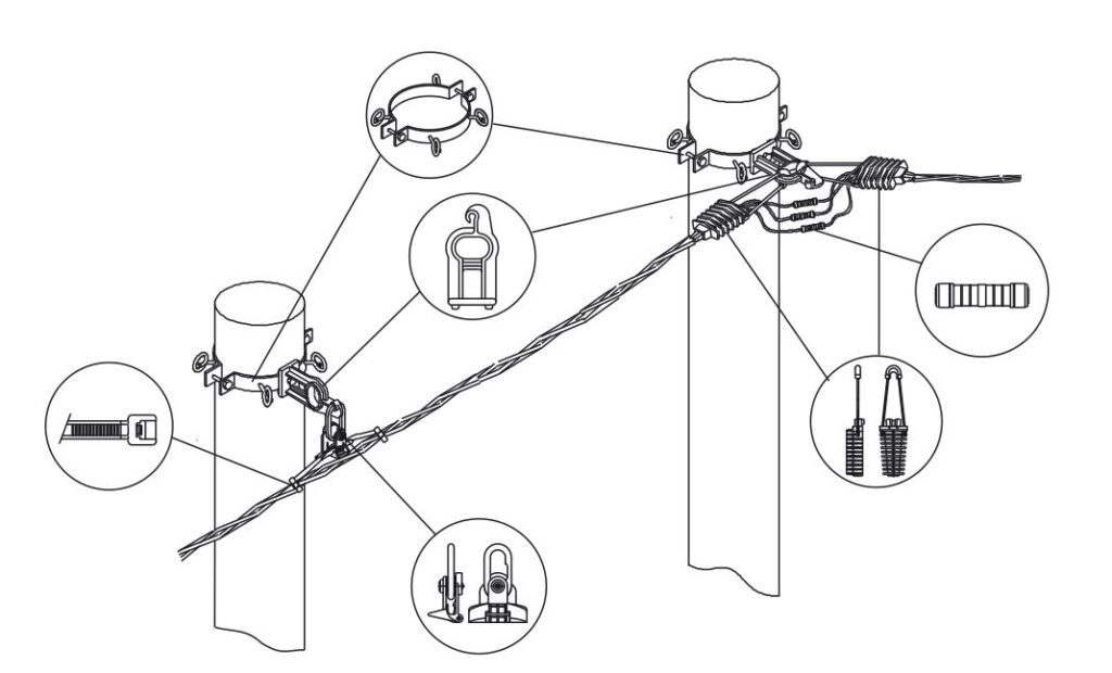 Noseće prihvatanje SKS-a izvodi se pomoću noseće stezaljke i Al univerzalne konzole. Prihvatanje se vrši preko nosećeg provodnika (54-71.5 mm) a snop se sa obe strane stezaljke obuhvata kablovskom vezicom da bi se sprečilo rasplitanje. Zatvaranjem specijalne kopče na stezaljci posle postavljanja provodnika onemogućava se slučajno otpuštanje SKS-a.