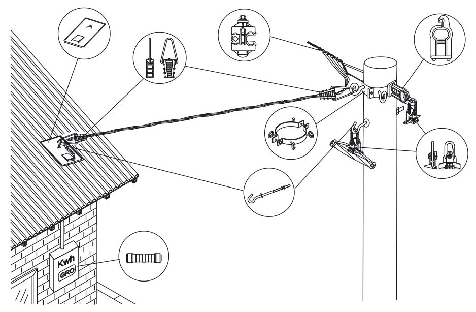 Kućni priključak samonosivim kablovskim snopom može se izvesti i na krovu kao što je prikazano na skici. Potrebno je na krov postaviti lim za kućni priključak kroz koji se vijak sa kukom učvršćuje za konstrukciju krova. Za kuku se kači zatezna stezaljka za kućni priključak, kojom se samonoseći kablovski snop prihvata. Sa stezaljke se kabl kroz otvor na limu za kućni priključak dalje vodi do glavnog razvodnog ormana (GRO) u kome se pomoću izolovanih vododihtujućih stezaljki – FID spaja sa kućnom instalacijom. Osim opreme na krovu potrebne su FIDOS stezaljke za spajanje za glavni distributivni vod.