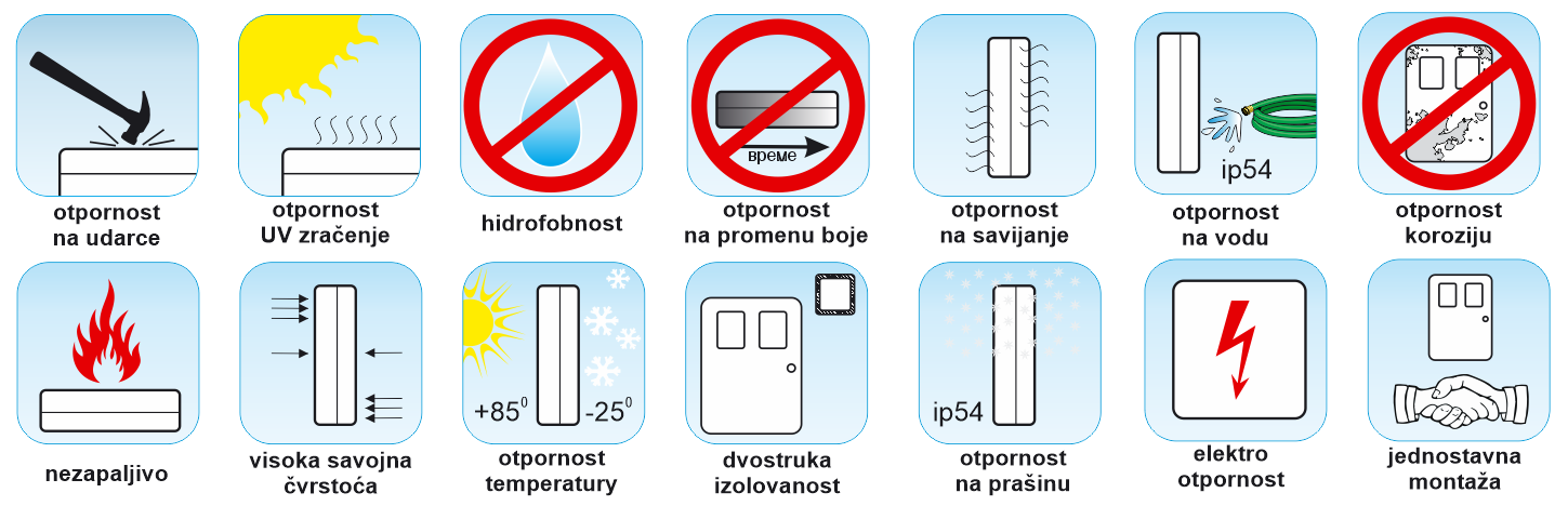 Zbog svojih tehničkih karakteristika mogu se koristiti u vlažnim prostorijama, sredinama gde je veliko prisustvo kiselina, prašina i soli, termoelektranama, prostorijama sa visokim i niskim temperaturama, u industrijskim halama itd. Korišćenje je jednostavno i bez dodatnog održavanja, otporan je na visoke i niske temperature. Veoma laka i jednostavna montaža i ugradnja.