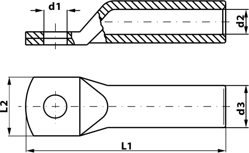 | Kodni broj | Oznaka mm²/Vijak M | d1 mm | d2 mm | d3 mm | L1 mm | L2 mm | Broj presovanja meh./hidr. | Pakovanje kom | Težina g/100kom |