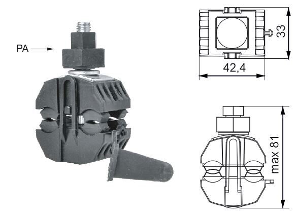 Koristi se za priključivanje odcepnog voda nisko naponskog samonosivog kablovskog snopa na distributivni samonosivi kablovski snop. Vodozaptivnost je obezbeđena specijalnom gumom otpornom na UV zračenje i sve atmosferske uticaje. Dihtovanje spoja pouzdano sprečava pojavu elektrolitičke korozije, a istovremeno je omogućeno spajanje Al i Cu vodova. Stezanje se vrši moment navrtkom. Pozicija 1 označava mesto kidanja moment navrtke (automatski se reguliše sila stezanja pomoću navrtke koja se kida tek kada je ostvaren odgovarajući moment 14 Nm). Za pritezanje se koristi ključ OK-13, a demontaža se vrši ključem OK-22. Prilikom montaže pod naponom obavezno je korišćenje zaštitnih rukavica. Stezaljka je urađena u skladu sa standardom EN 50483.