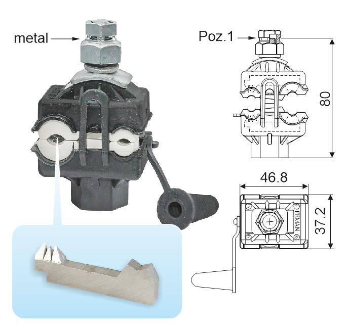 Koristi se za priključivanje odcepnog voda nisko naponskog samonosivog kablovskog snopa sa neizolovanog aluminijumskog provodnika. Telo stezaljke je napravljeno od poliamida sa staklenim vlaknima koji je otporan na sve klimatske i mehaničke uticaje. Kontakni mostići su izrađeni od aluminijumske legure. Kontakt s provodnikom za odcep se obezbeđuje sa zubićima za probijanje izolacije, a kontakt sa neizolovanim provodnikom napravljen je u vidu pločica kako se ne bi smanjila provodljivost provodnika. Vodozaptivnost je obezbeđena specijalnom gumom otpornom na UV-zračenje i sve atmosferske uticaje. Za pritezanje stezaljke koristiti ključ OK-13, a demontaža se vrši ključem OK-17. Koristi se za glavni neizolovani provodnik 6 do 150mm² i odcepni izolovani provodnik 2,5 do 35mm². Stezaljka je urađena u skladu sa standardom EN 50483.