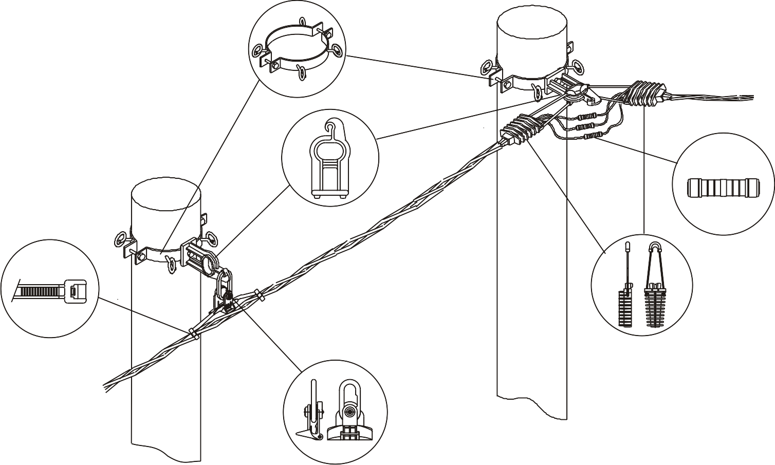 Noseće prihvatanje SKS-a izvodi se pomoću noseće stezaljke i Al univerzalne konzole. Prihvatanje se vrši preko nosećeg provodnika (54-71.5 mm) a snop se sa obe strane stezaljke obuhvata kablovskom vezicom da bi se sprečilo rasplitanje. Zatvaranjem specijalne kopče na stezaljci posle postavljanja provodnika onemogućava se slučajno otpuštanje SKS-a.